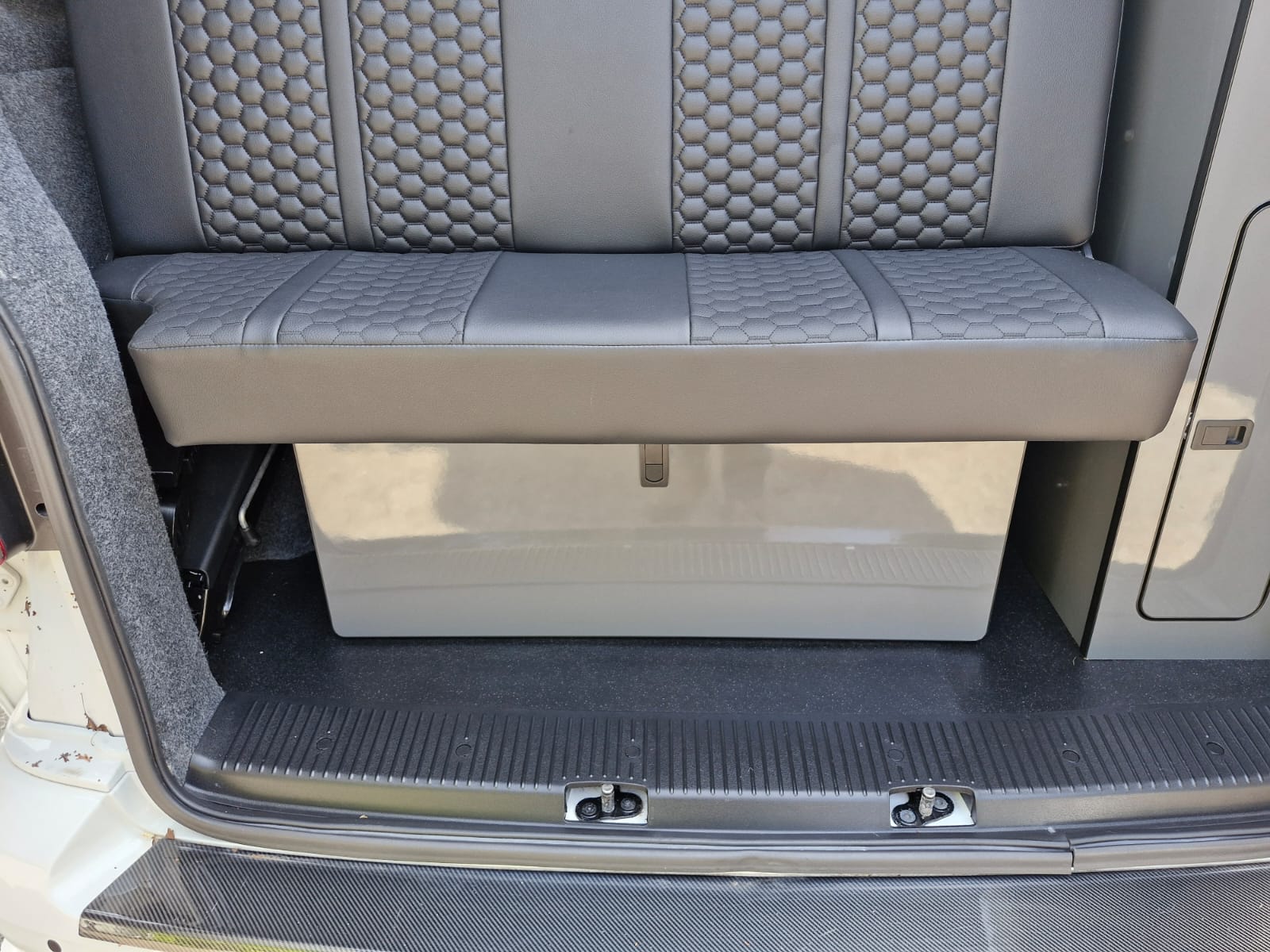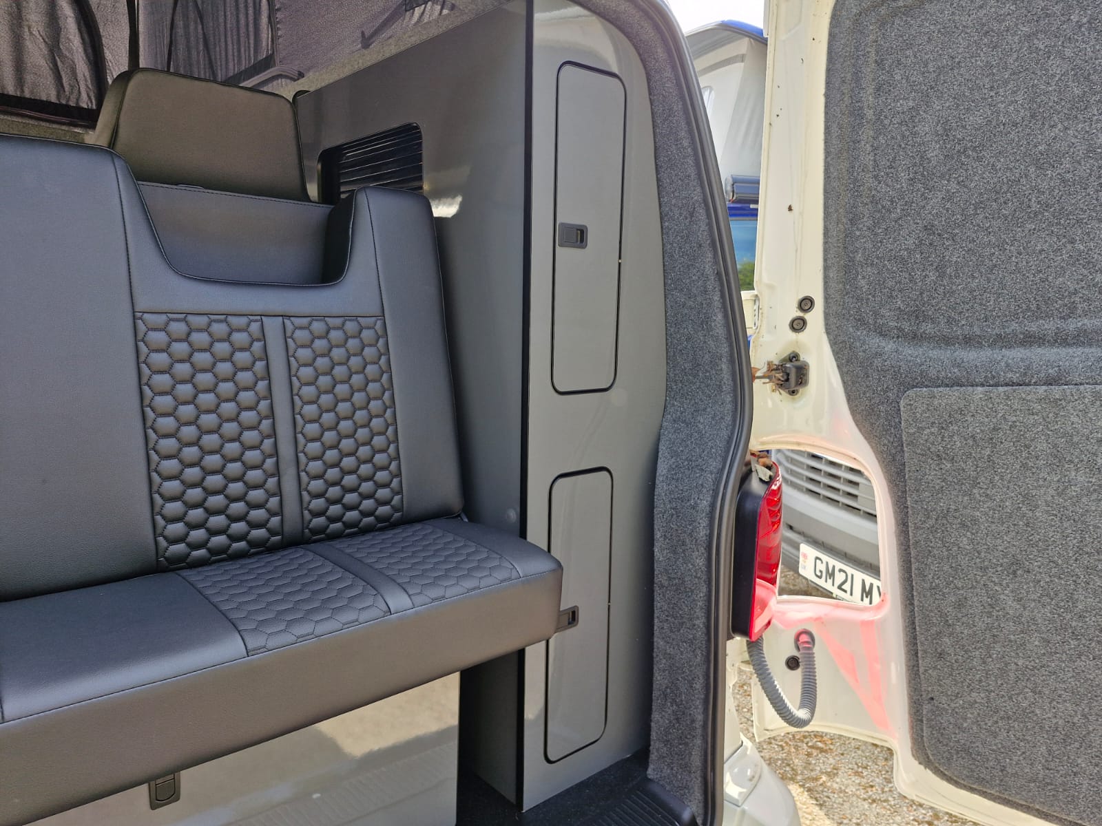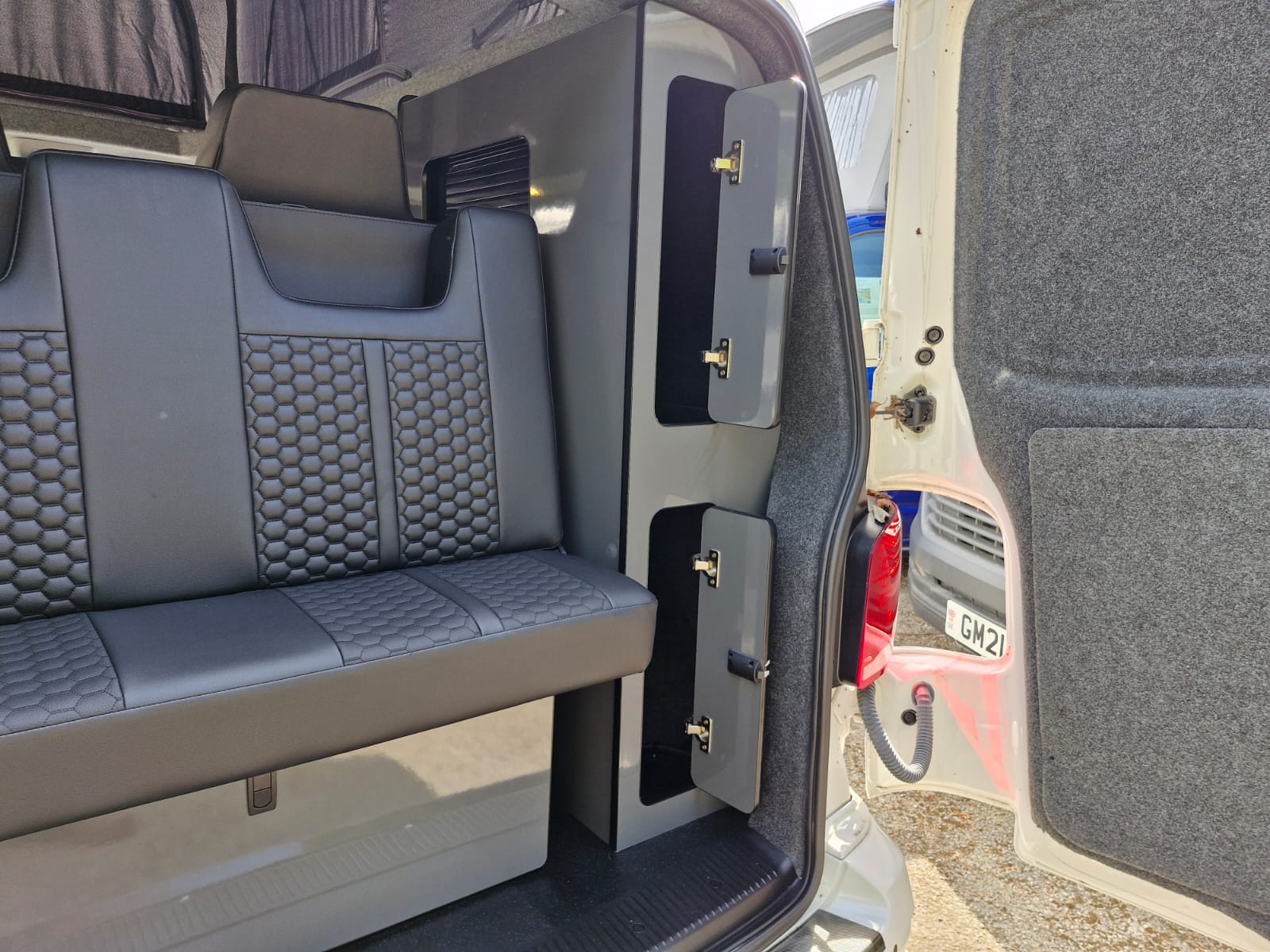 Leather seats front and rear and 5 seat belts, 240v double plug socket with USB ports, 12v setup inc leisure battery, leisure battery tray & split charge relay, Sargent charger, double burner hob & sink combo with glass lid, cold water tap & 12v water pump, fresh water container, external waste, camping gaz 907 gas regulator, fire extinguisher, led lights, compressor fridge, easy action rock and roll bed, gas ram to enable easy lifting, double overhead storage unit.