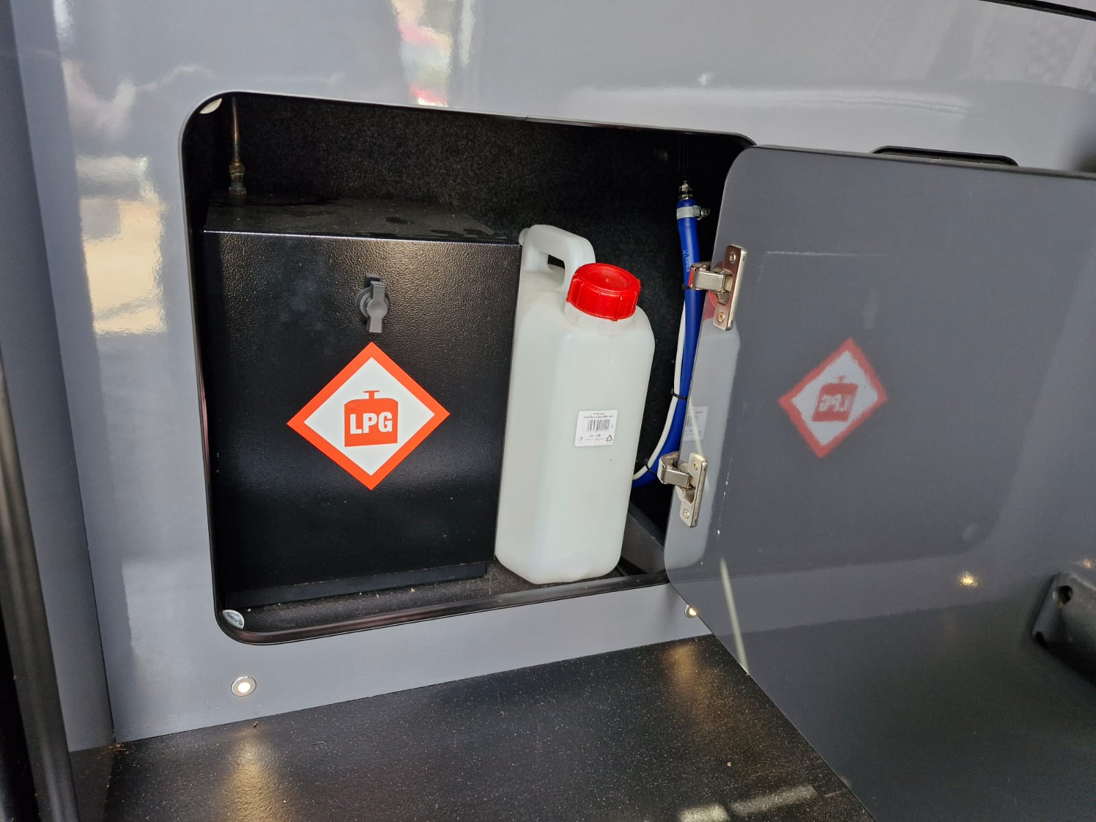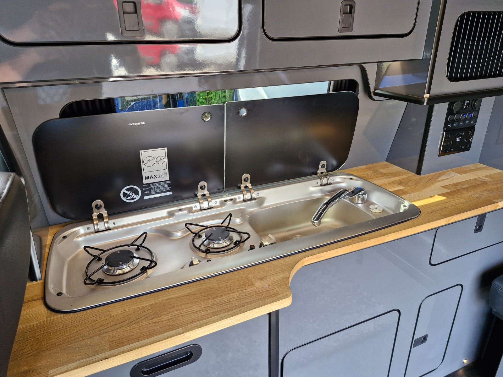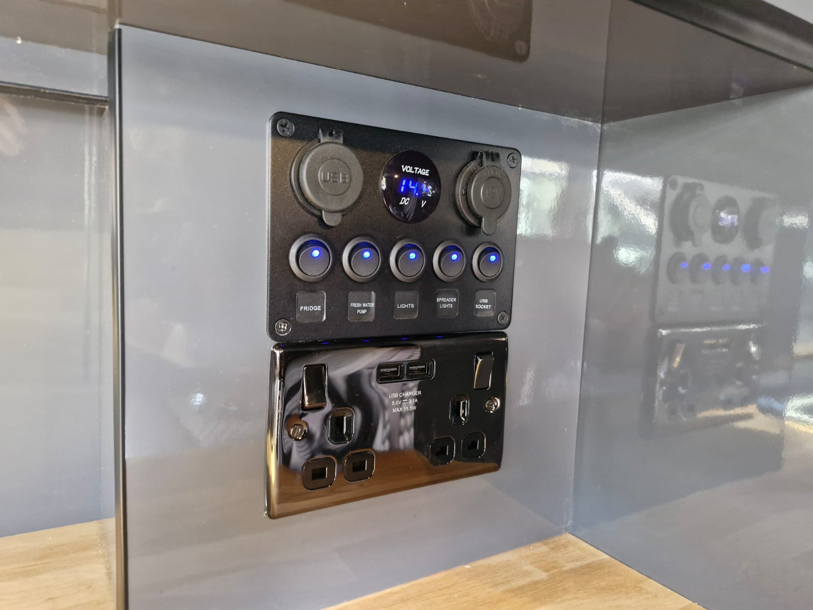 Leather seats front and rear and 5 seat belts, 240v double plug socket with USB ports, 12v setup inc leisure battery, leisure battery tray & split charge relay, Sargent charger, double burner hob & sink combo with glass lid, cold water tap & 12v water pump, fresh water container, external waste, camping gaz 907 gas regulator, fire extinguisher, led lights, compressor fridge, easy action rock and roll bed, gas ram to enable easy lifting, double overhead storage unit.
