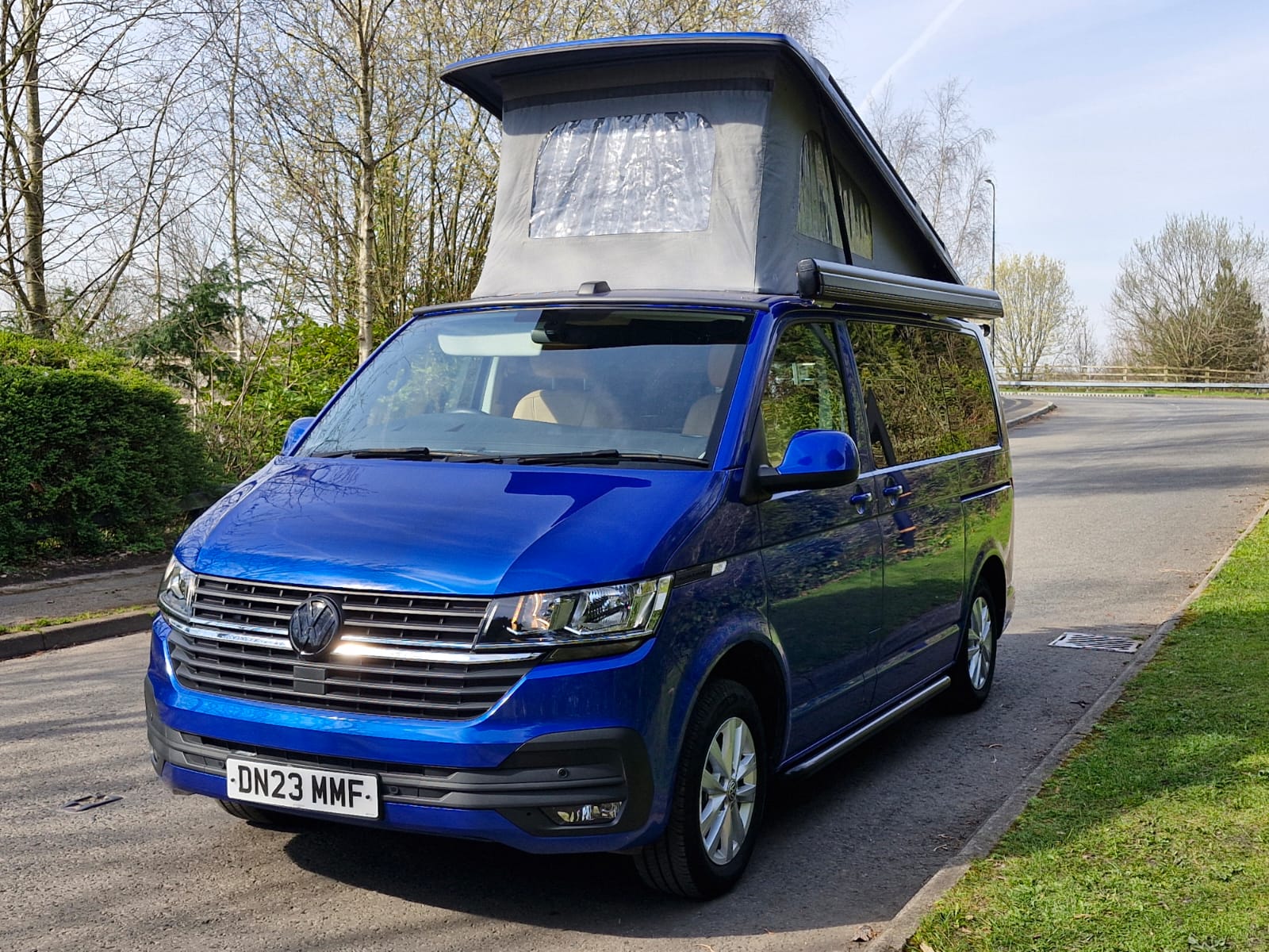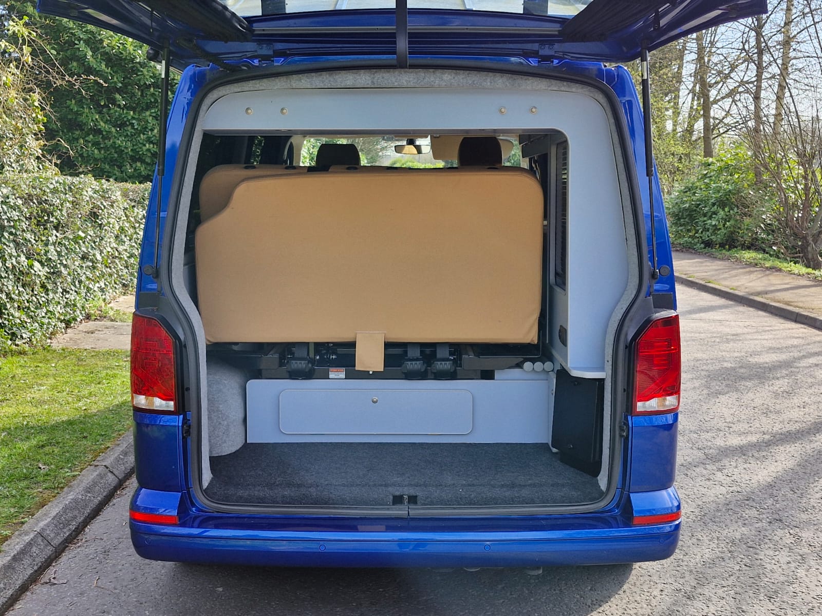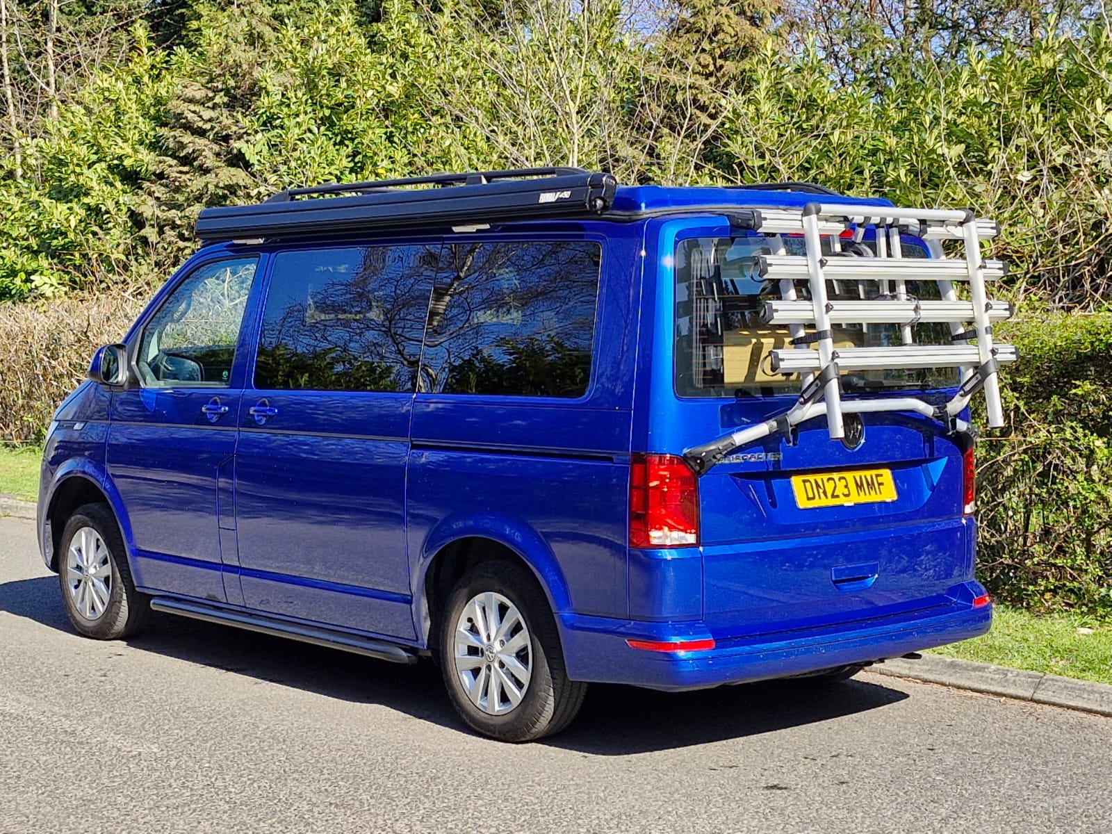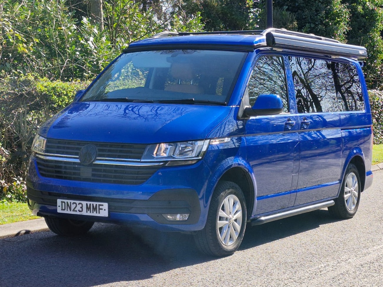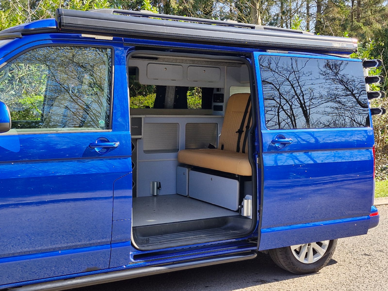 2023 VW Transporter HIGHLINE T6.1 EURO 6, SWB, Ravenna Blue, Superb CamperKing Le Mans Conversion. Includes Factory LED Lights, Front and Rear Reverse Sensors, Heated Front Screen, Folding Mirrors, Adaptive Cruise Control, Single Front passenger swivel seat, Three Rear Seats with ISOFIX making a Super Large Titan Bed, Premium leather upholstery, Industry Leading Huge Rear Storage space between Rear Seating and Tailgate, Under Seat Storage Sliding Drawer Cupboard, Bespoke Cabinet Furniture with matching tables and 3 positions, Full LED Lighting, Dometic Hob and Sink Combination, 12v Fridge Freezer, Full Webasto Programmable Blown Air Heating.