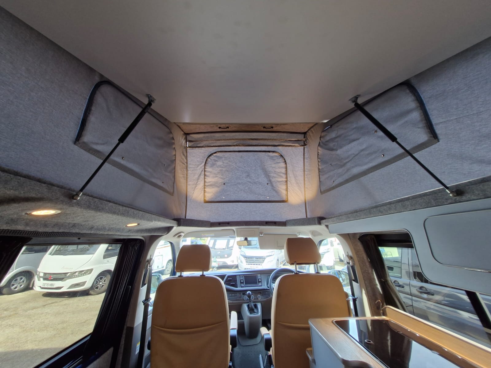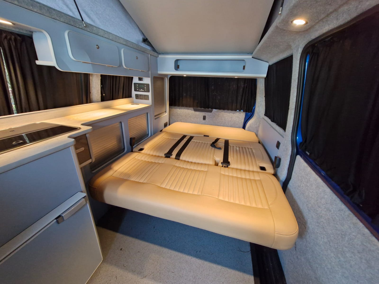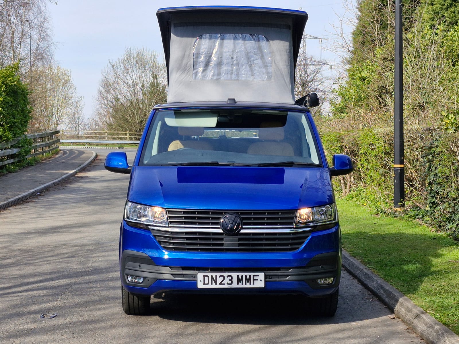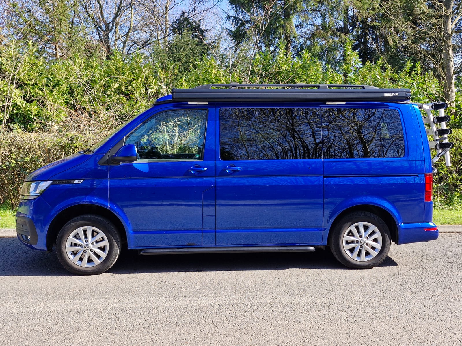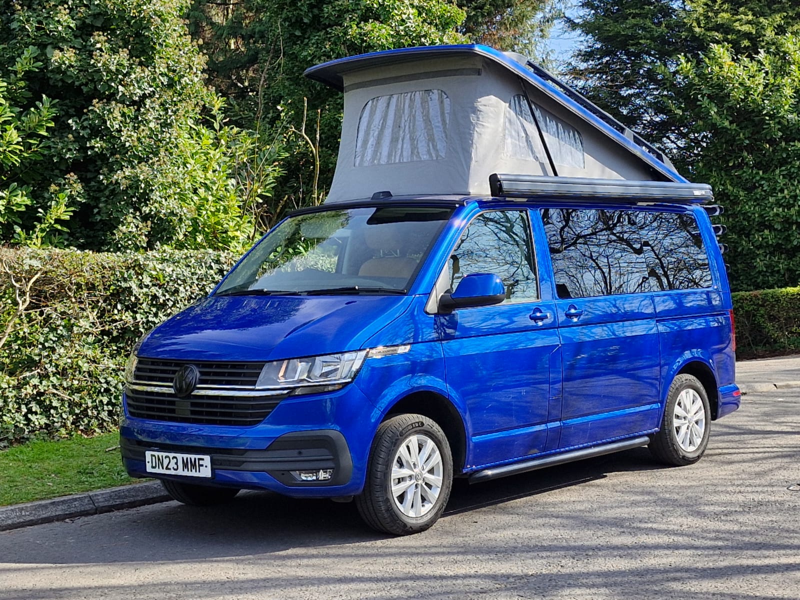 2023 VW Transporter HIGHLINE T6.1 EURO 6, SWB, Ravenna Blue, Superb CamperKing Le Mans Conversion. Includes Factory LED Lights, Front and Rear Reverse Sensors, Heated Front Screen, Folding Mirrors, Adaptive Cruise Control, Single Front passenger swivel seat, Three Rear Seats with ISOFIX making a Super Large Titan Bed, Premium leather upholstery, Industry Leading Huge Rear Storage space between Rear Seating and Tailgate, Under Seat Storage Sliding Drawer Cupboard, Bespoke Cabinet Furniture with matching tables and 3 positions, Full LED Lighting, Dometic Hob and Sink Combination, 12v Fridge Freezer, Full Webasto Programmable Blown Air Heating.