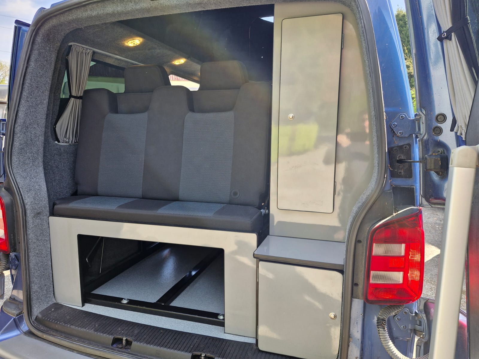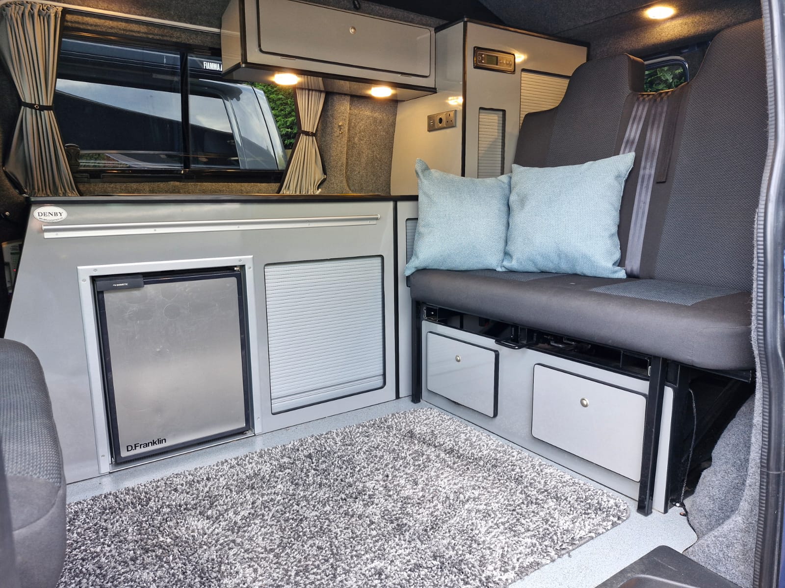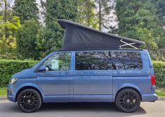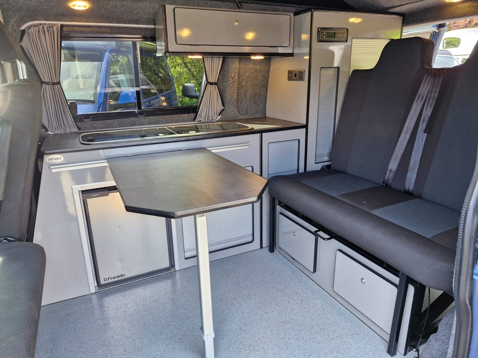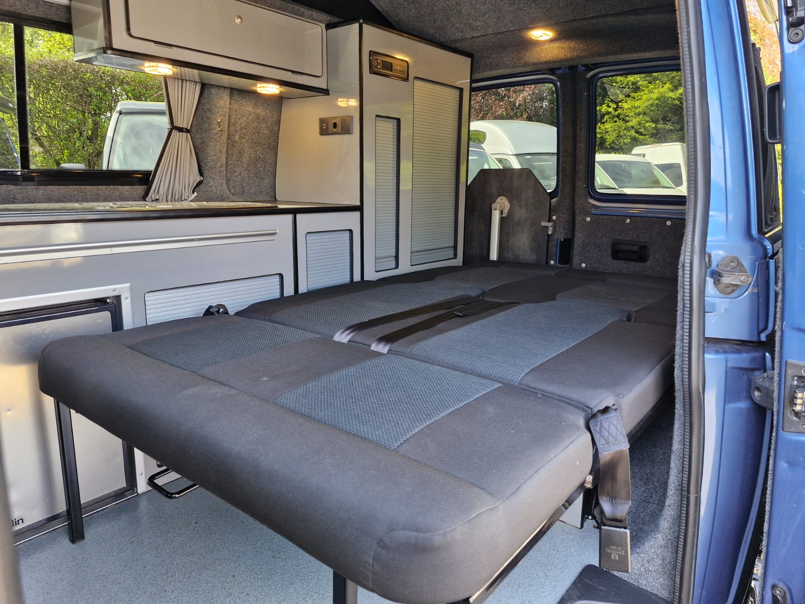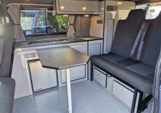 This lovely Blue Denby camper conversion has all the features you’d expect from a quality factory built camper. Perfect for use as a daily vehicle as well as a holiday van. Both comfortable and practical, this van conversion boasts fantastic storage, atmospheric lighting, a rock n roll bed in the end lounge layout, comfortably accommodating up to 4 berth and 5 travelling seats.