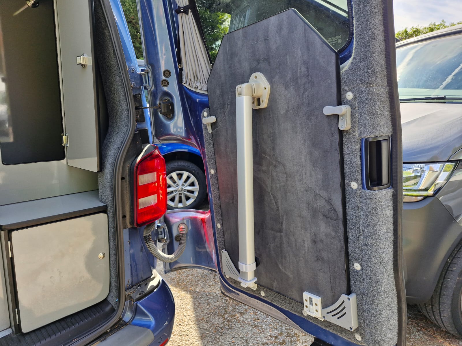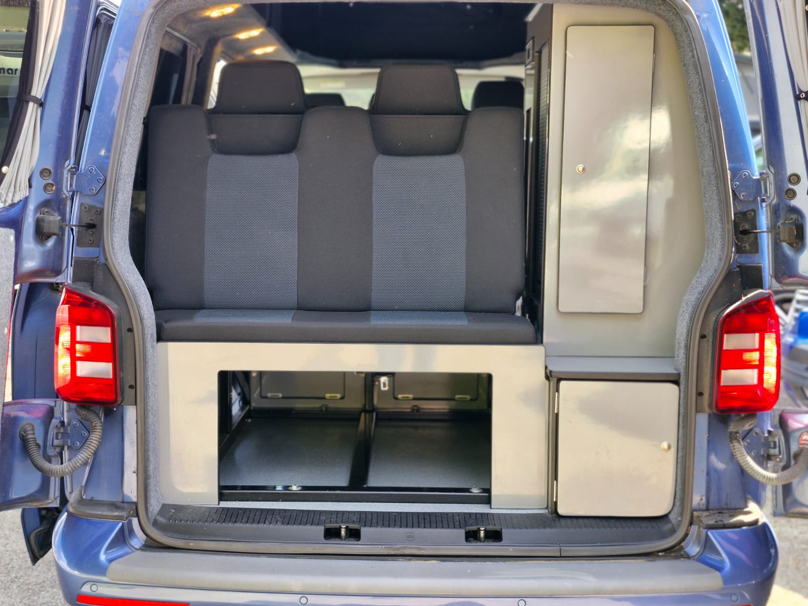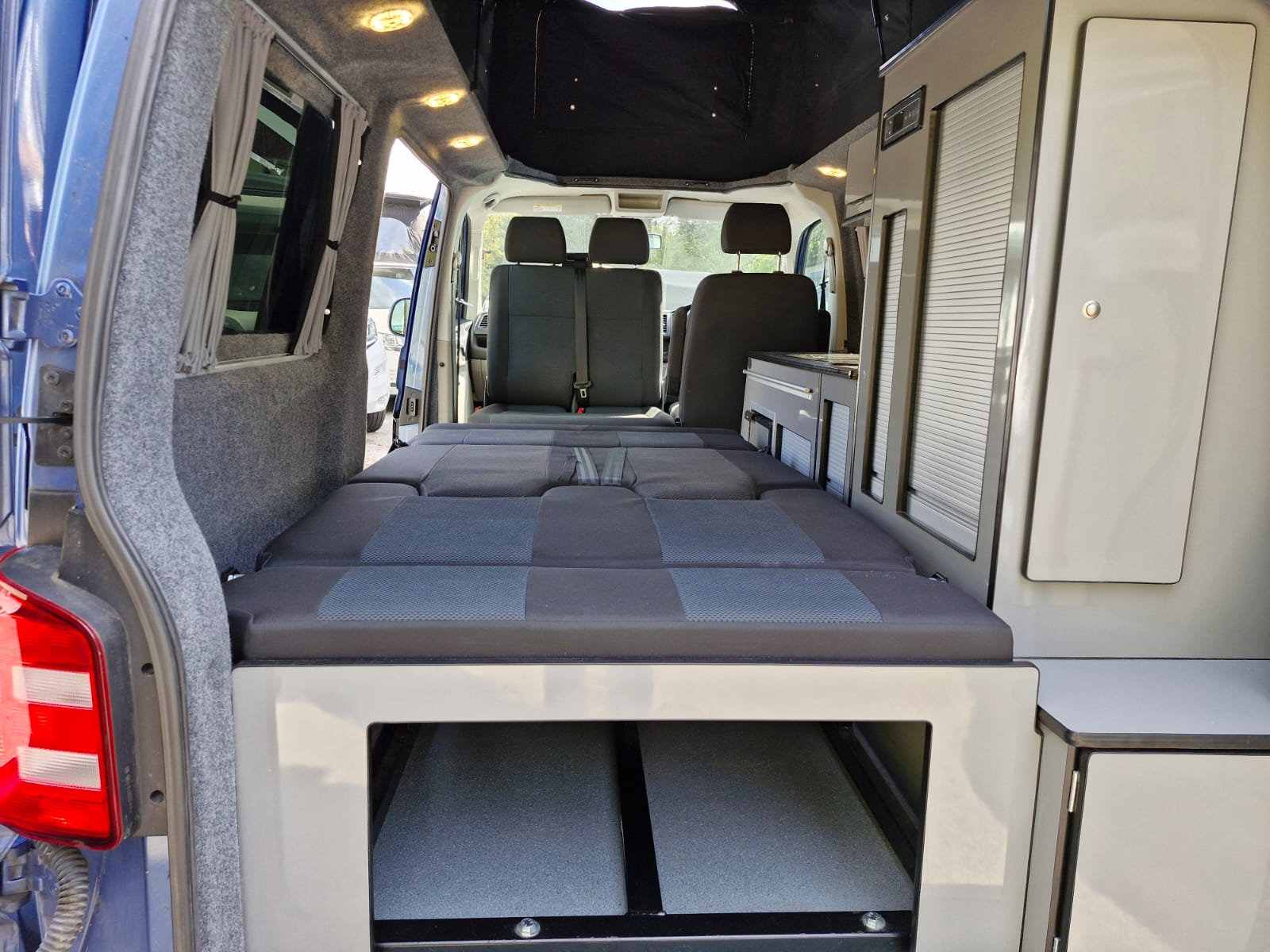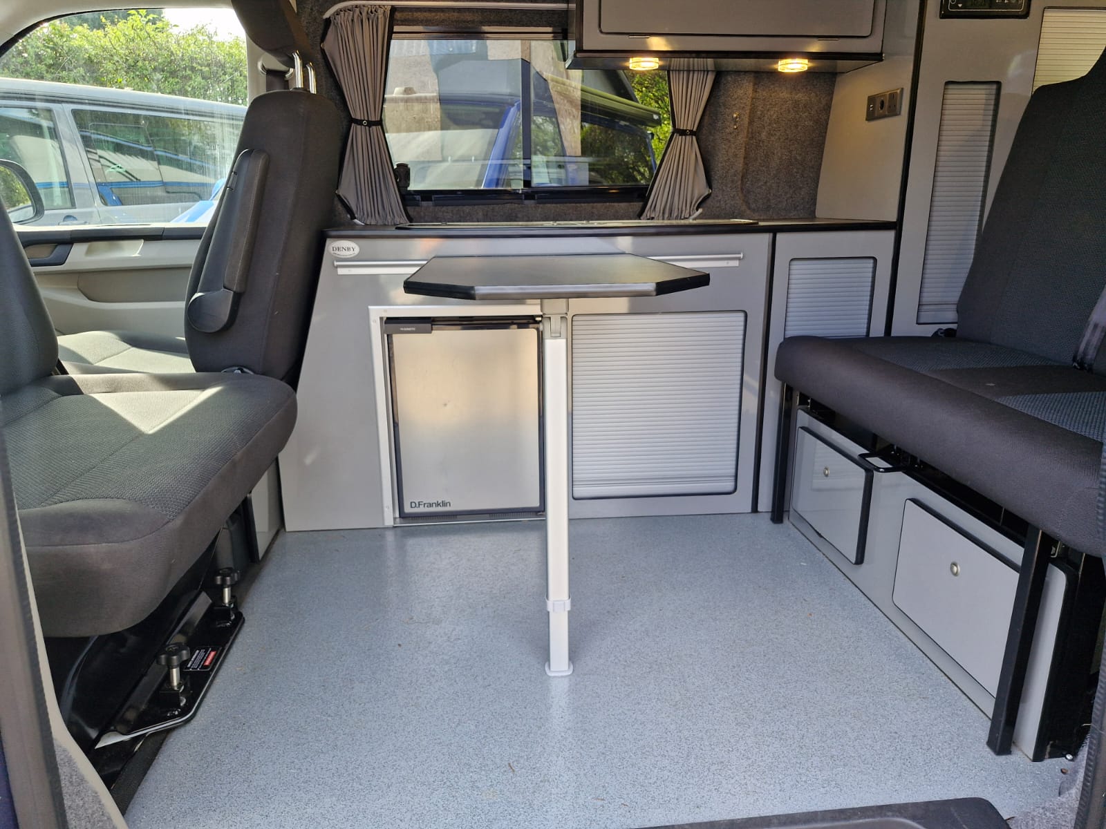 This lovely Blue Denby camper conversion has all the features you’d expect from a quality factory built camper. Perfect for use as a daily vehicle as well as a holiday van. Both comfortable and practical, this van conversion boasts fantastic storage, atmospheric lighting, a rock n roll bed in the end lounge layout, comfortably accommodating up to 4 berth and 5 travelling seats.