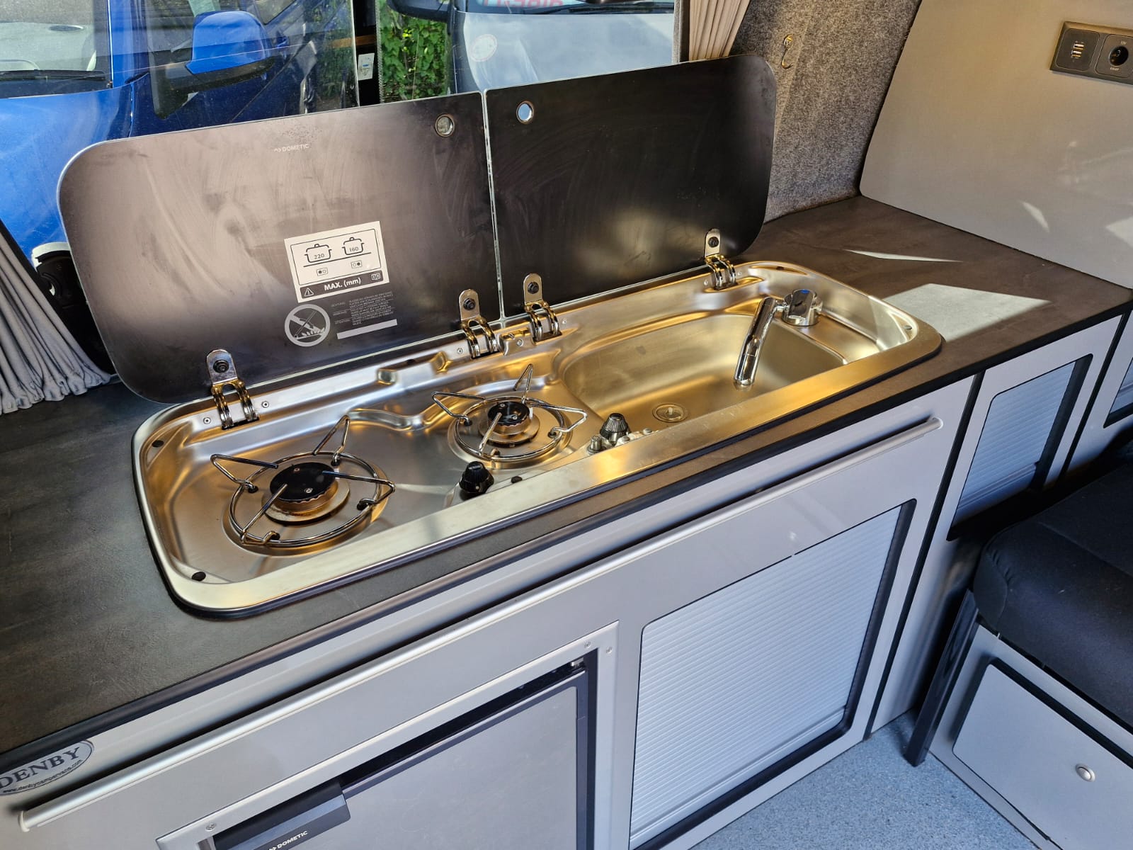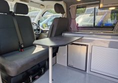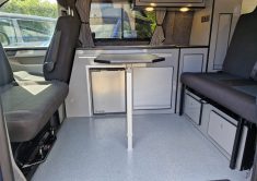The Denby Campervans have a fully lined and insulated interior, M1 VOSA tested Roof and Bed System, a front passenger double swivel seat, blackout cab curtains in the rear, alongside a kitchen with twin gas hob, sink, fridge/freezer. The side kitchen units and wardrobe, made from lightweight laminated ply, offer ample storage space with space-saving tambour doors. Plenty storage under the bed for all your camping gear and even a porta potti.