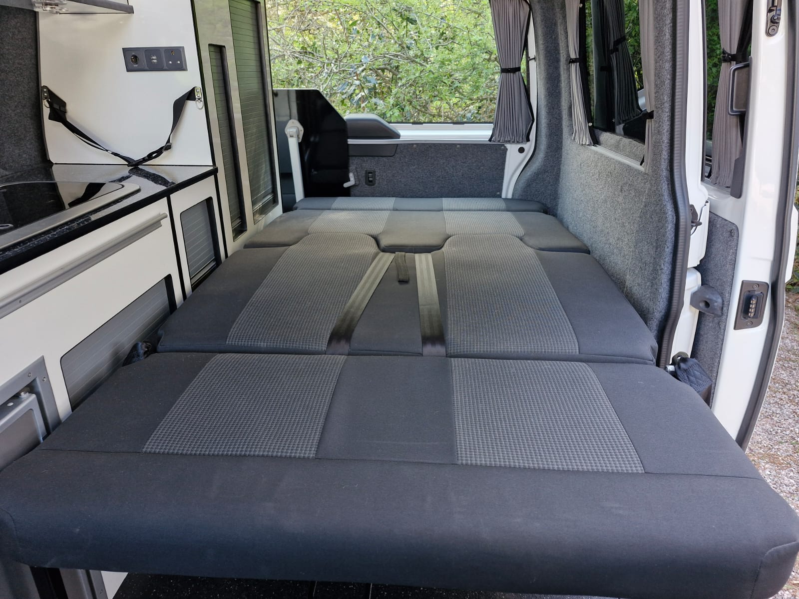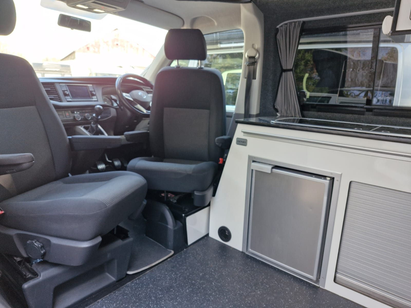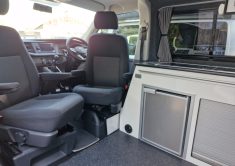 The Denby Campervans have a fully lined and insulated interior, M1 VOSA tested Roof and Bed System, a front passenger double swivel seat, blackout cab curtains in the rear, alongside a kitchen with twin gas hob, sink, fridge/freezer. The side kitchen units and wardrobe, made from lightweight laminated ply, offer ample storage space with space-saving tambour doors. Plenty storage under the bed for all your camping gear/ driveaway awnings etc.